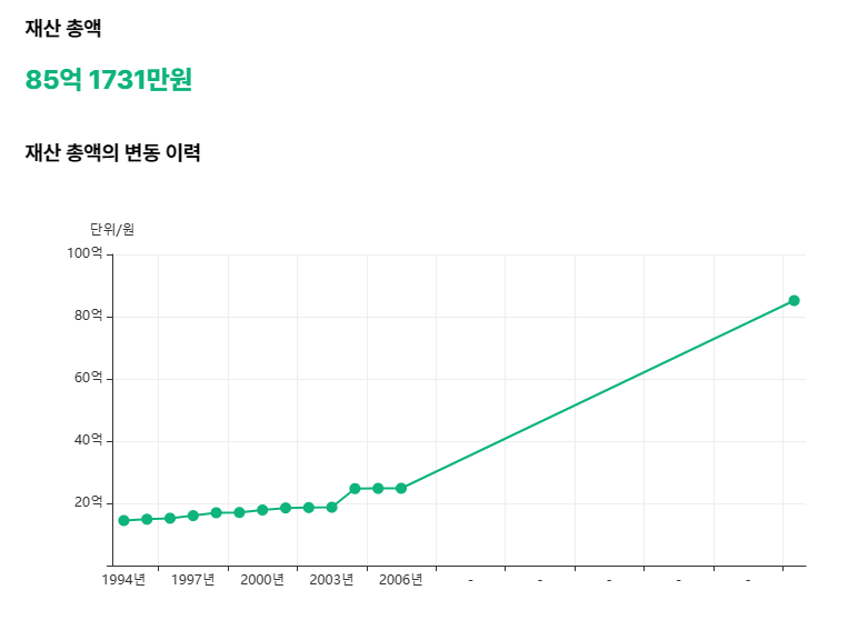 그의 재산은 현재 85억여원으로 확인 되어 지고 있다.